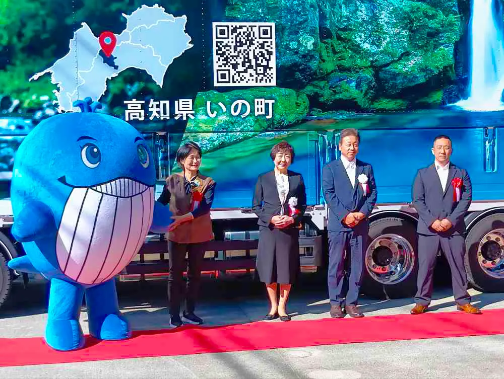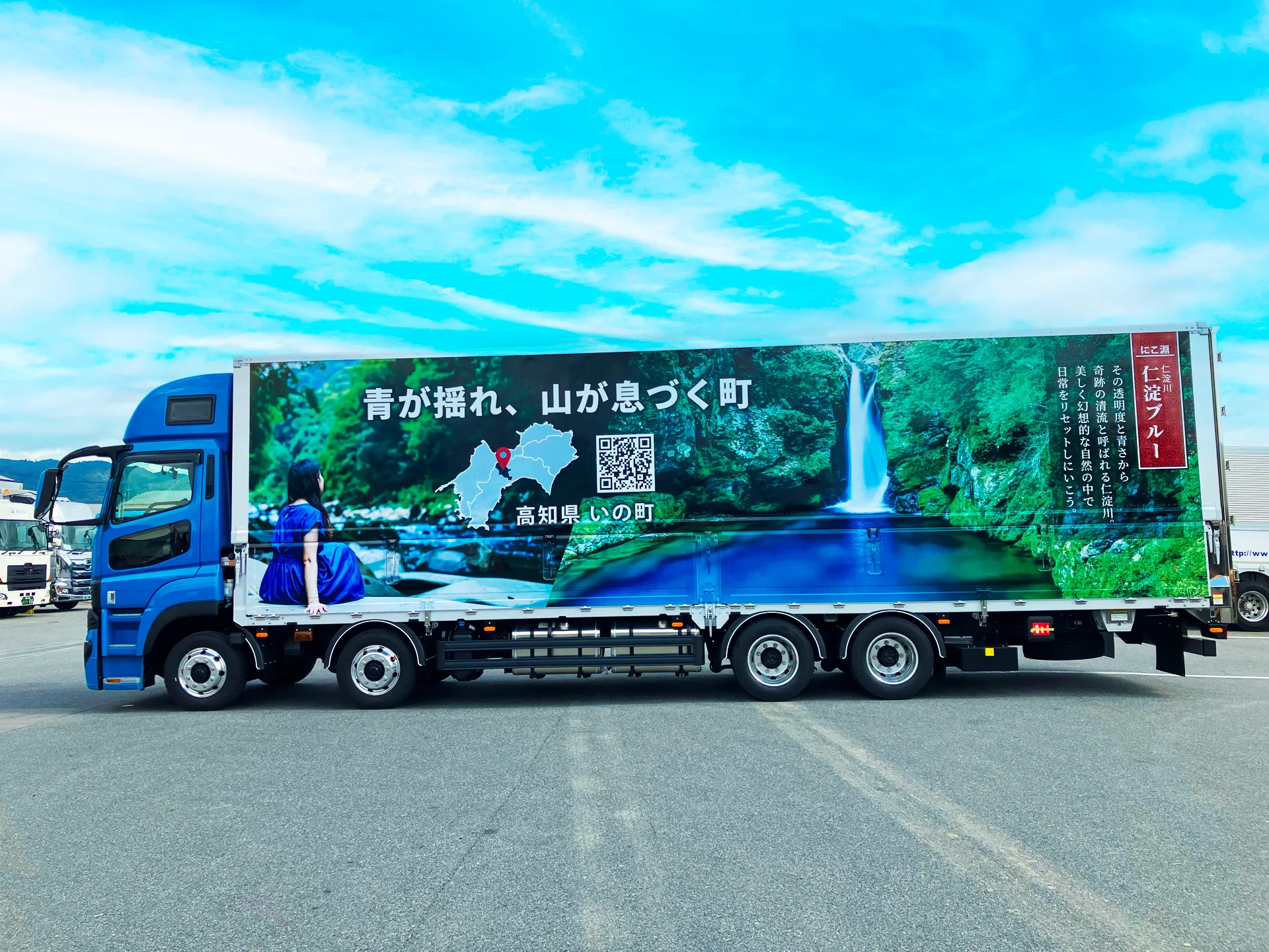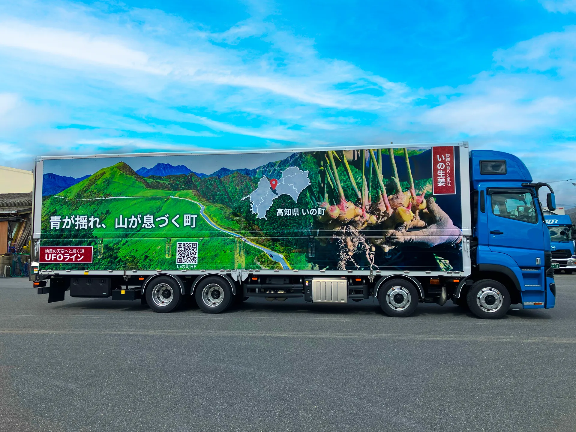日本製紙パピリア高知工場様からの提案により、平素よりお世話になっている地元であるいの町様にお役に立てることしたい、との想いから、高知工場様と四国トランスポートの共同でいの町役場様に提案し、自然を主体とした観光名所をデザインし、名産品である生姜を加え、豊かな自然と水をアピールできるデザインとなっております。